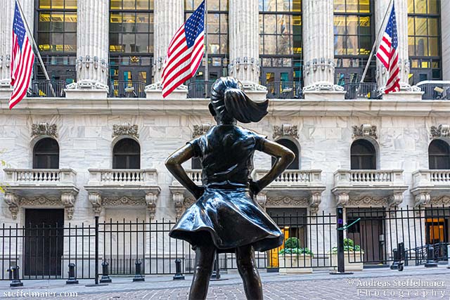 The #FearlessGirl – The unique bronze #statue by Kristen Visbal on #WallStreet, #Manhattan promotes female #empowerment in a rough environment. Moved from it’s original place facing the Charging Bull statue, it’s now facing down on the #NewYork #StockExchange in the Financial District of #NewYorkCity.