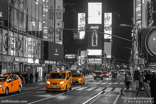 Following up with a (mostly) #blackwhite shot of #TimesSquare, #NYC at #night with cars rushing down 7th #Ave – this truly shows that this #city has finally recovered and it still never sleeps. Fun fact – while most #cabs in #Manhattan, #NY carry the typical #yellow color, cabs in the surrounding #NewYorkCity boroughs have a more green-ish paint…